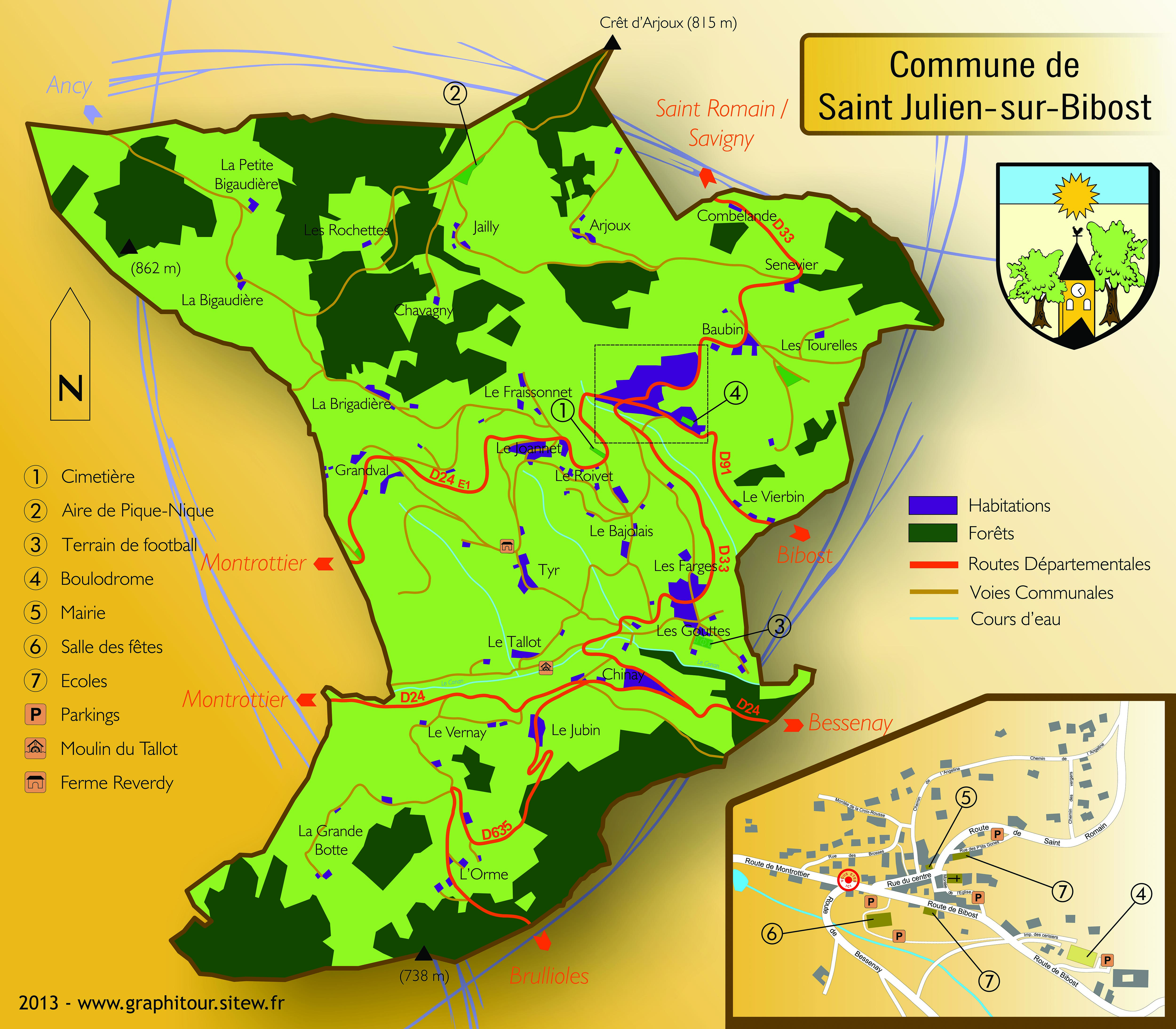Village rural de 579 âmes sur une superficie de 1323 ha très vallonnés, Saint Julien sur Bibost se situe au pied du crêt d’Arjoux (817m).
